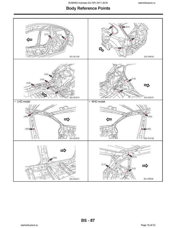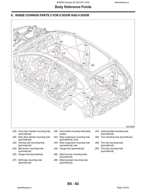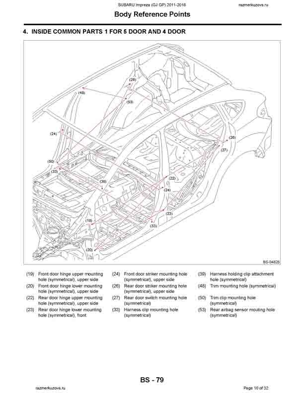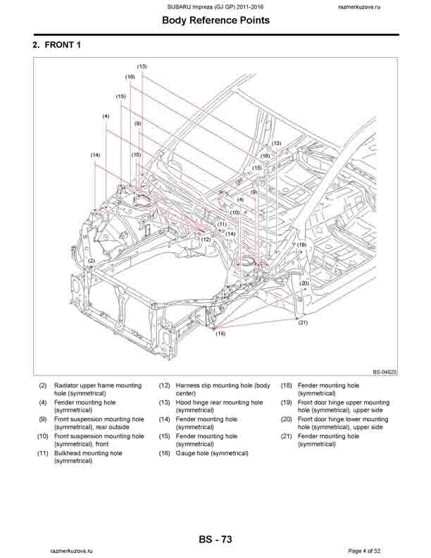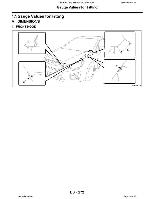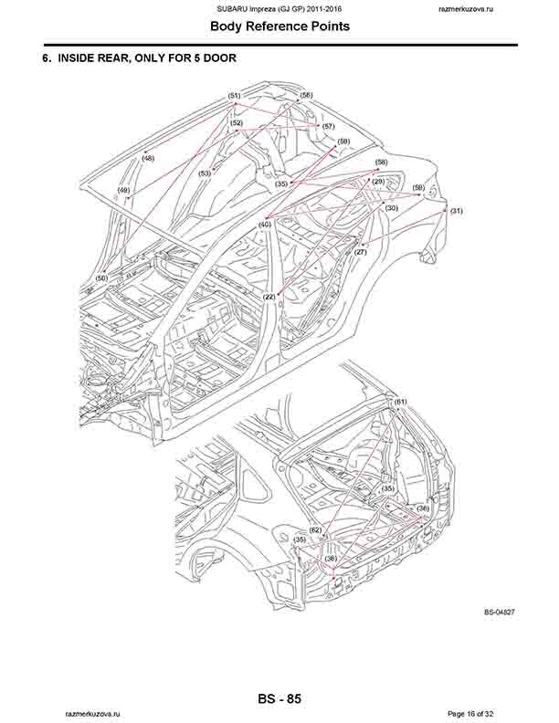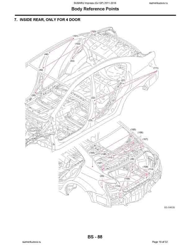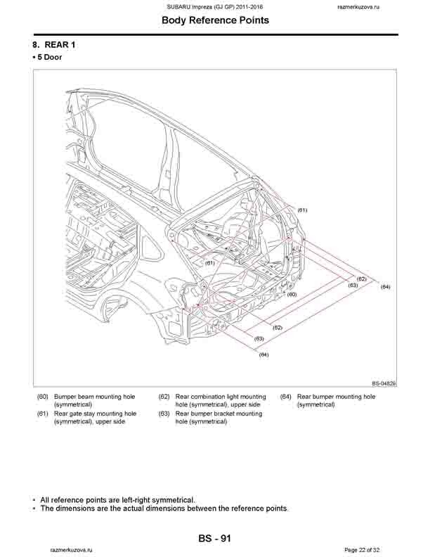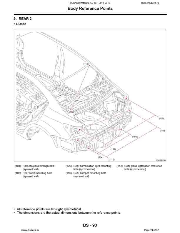 - Из заводского руководства по ремонту кузова SUBARU Impreza (GJ, GP) 2011-2016, в том числе размеры проемов. Дополнительно приведены величины допустимых зазоров кузовных панелей.