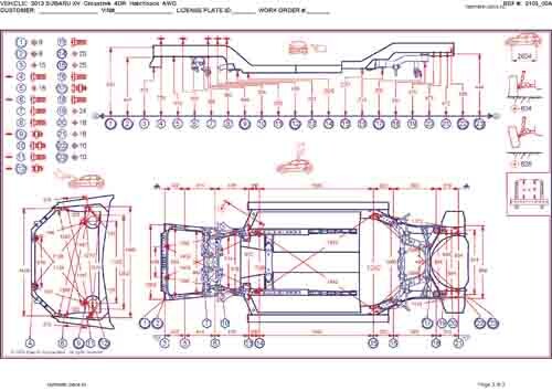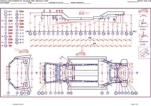 - Геометрические размеры кузова SUBARU XV, Crosstrek 2012-2017, как проекционные, так и непосредственного измерения, в том числе диагональные размеры проемов кузова и контрольные точки для восстановления геометрии кузова.