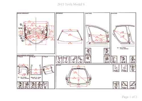 - Геометрические размеры кузова TESLA Model S 2012-2016, как проекционные, так и непосредственного измерения, в том числе диагональные размеры проемов кузова и контрольные точки для восстановления геометрии кузова.