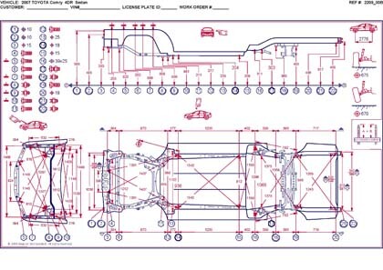 -Геометрические размеры, как проекционные, так и непосредственного измерения, в том числе диагональные размеры проемов кузова и контрольные точки для восстановления геометрии.