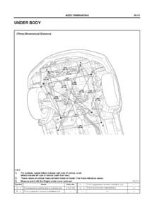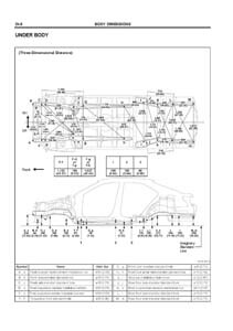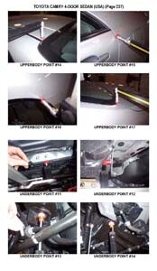 - Проекционные геометрические размеры кузова с привязкой к стапелю. Дополнительно приведены цветные фотографии мест расположения контрольных точек на реальном автомобиле.