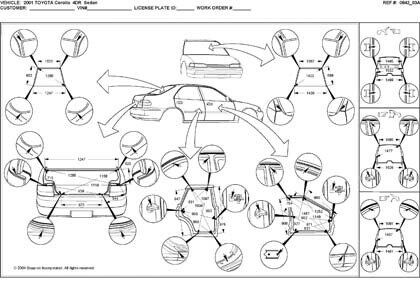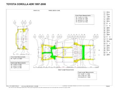 -Геометрические размеры, как проекционные, так и непосредственного измерения, в том числе диагональные размеры проемов кузова и контрольные точки для восстановления геометрии.