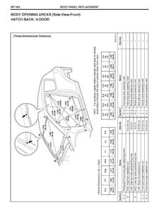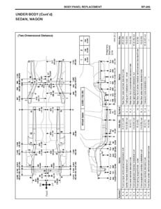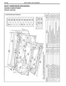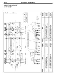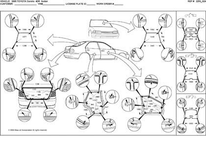 - Проекционные геометрические размеры кузова с привязкой к стапелю. Дополнительно приведены цветные фотографии мест расположения контрольных точек на реальном автомобиле.