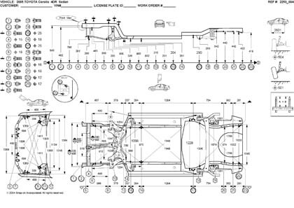 -Геометрические размеры, как проекционные, так и непосредственного измерения, в том числе диагональные размеры проемов кузова и контрольные точки для восстановления геометрии.