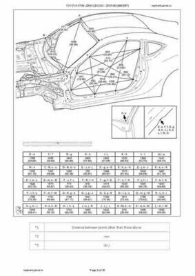 - Из официального руководства по ремонту кузова TOYOTA GT86 (ZN6) (2012-03 - 2016-06), в том числе диагональные размеры проемов.
