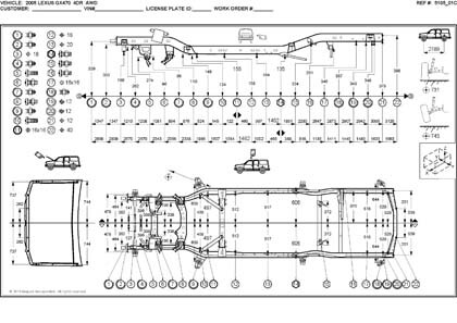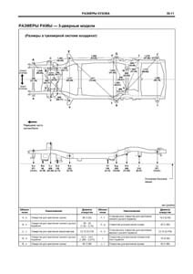 - Проекционные геометрические размеры кузова с привязкой к стапелю. Дополнительно приведены цветные фотографии мест расположения контрольных точек на реальном автомобиле.