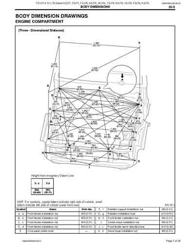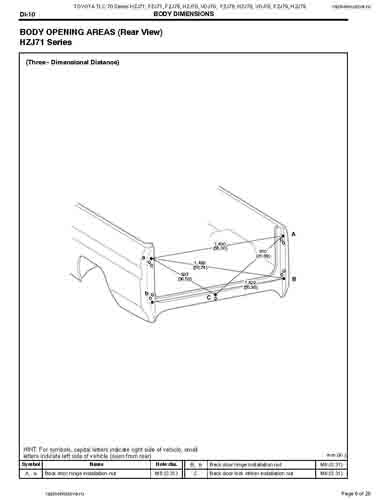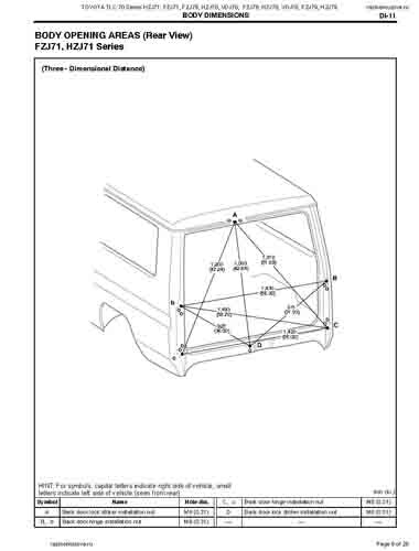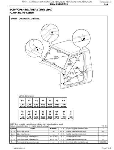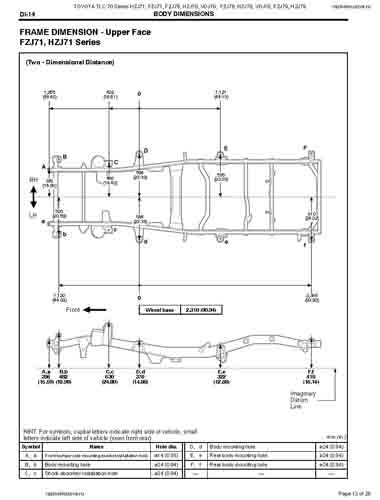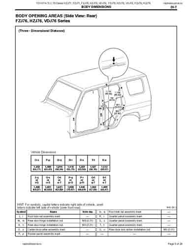- Геометрические размеры кузова из официального руководства по ремонту TOYOTA Land Cruiser 70 1984-2007 Series HZJ71, FZJ71, FZJ76, HZJ76, VDJ76, FZJ78, HZJ78, VDJ78, FZJ79, HZJ79, как проекционные, так и непосредственного измерения, в том числе диагональные размеры проемов кузова и контрольные точки для восстановления геометрии.