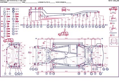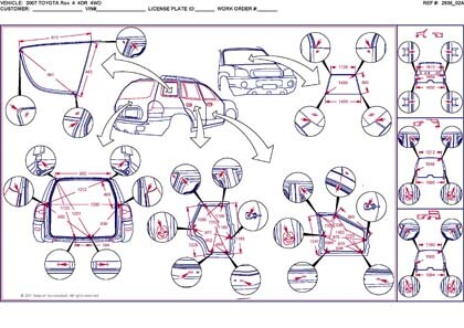 -Геометрические размеры, как проекционные, так и непосредственного измерения, в том числе диагональные размеры проемов кузова и контрольные точки для восстановления геометрии.