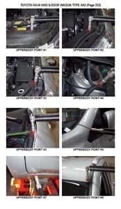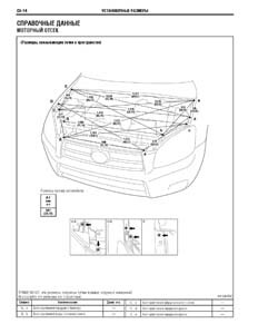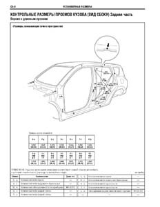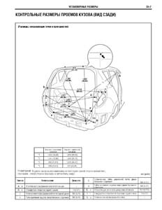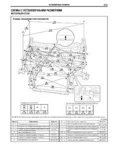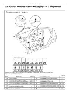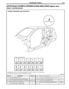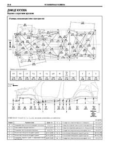 - Проекционные геометрические размеры кузова с привязкой к стапелю. Дополнительно приведены цветные фотографии мест расположения контрольных точек на реальном автомобиле.