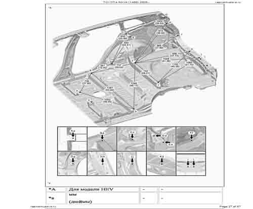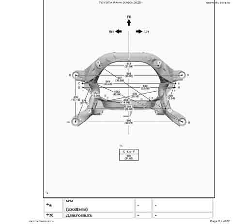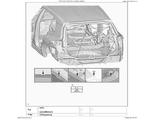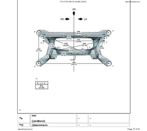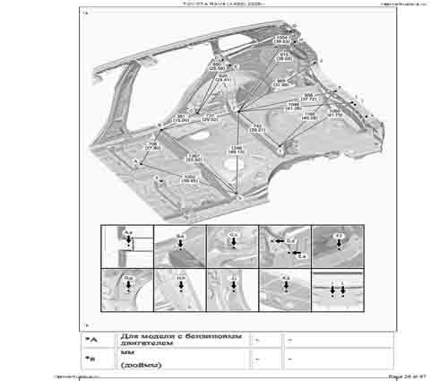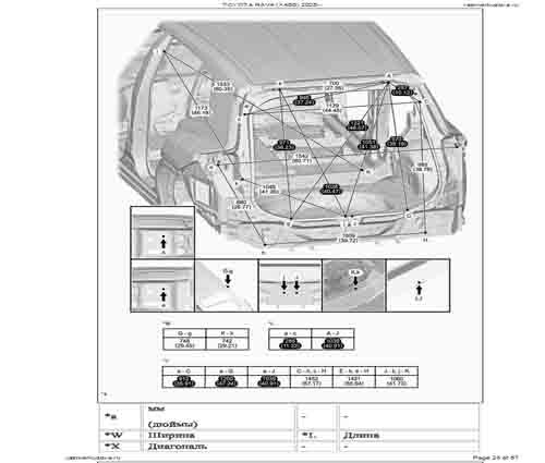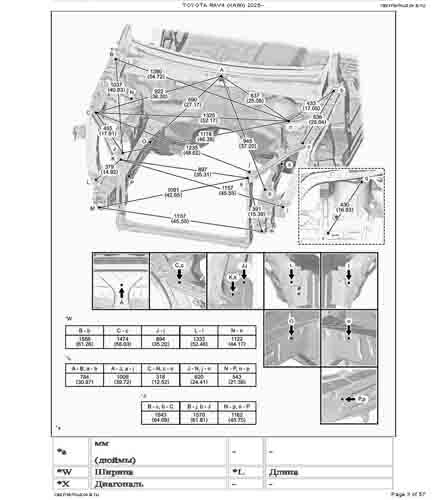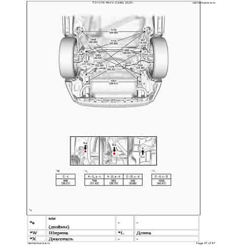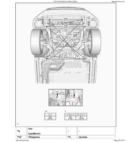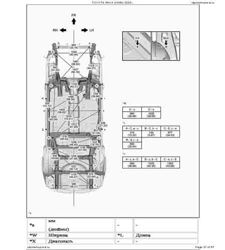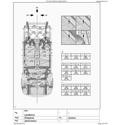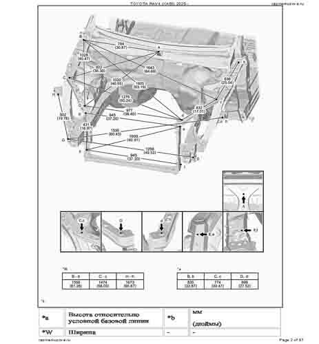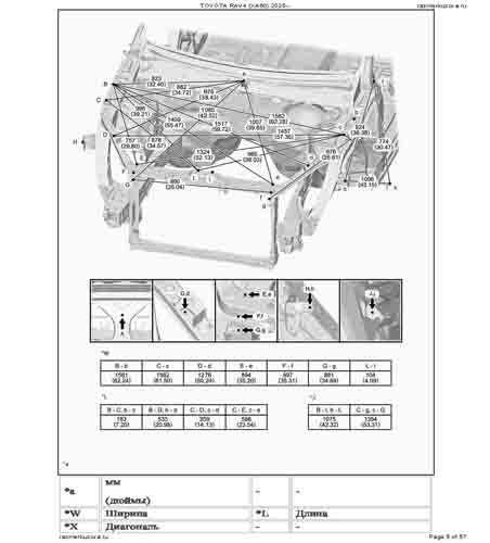 - Геометрические размеры кузова из официального руководства по ремонту TOYOTA RAV4 (XA60) 2025--, как проекционные, так и непосредственного измерения, в том числе диагональные размеры проемов кузова и контрольные точки для восстановления геометрии.