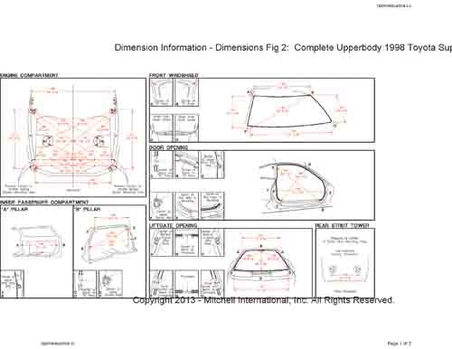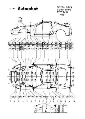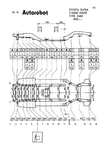 - Геометрические размеры кузова TOYOTA SUPRA 1993-2003, как проекционные, так и непосредственного измерения, в том числе диагональные размеры проемов кузова и контрольные точки для восстановления геометрии.