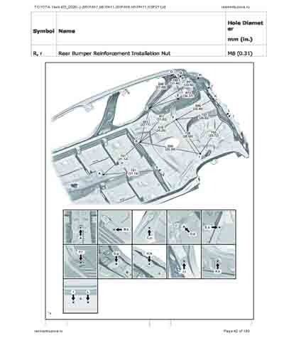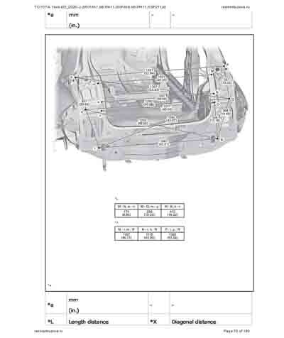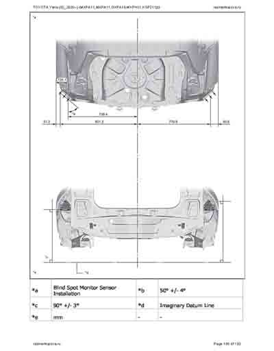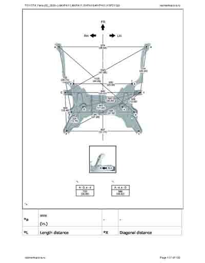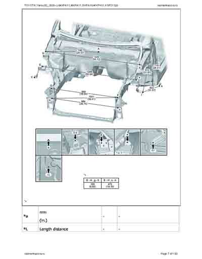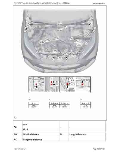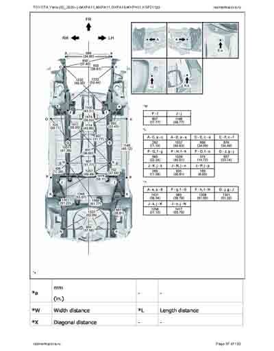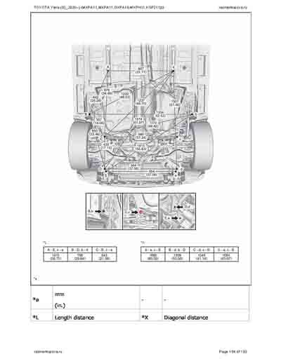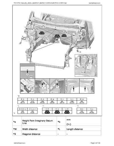 - Из официального руководства по ремонту кузова TOYOTA Yaris (03_2020--) (MXPA11,MXPA11,MXPH11,KSP211) и GR Yaris (GXPA16), в том числе диагональные размеры проемов. Рассмотрены 3-х и 5-ти дверные модели. На 192стр.