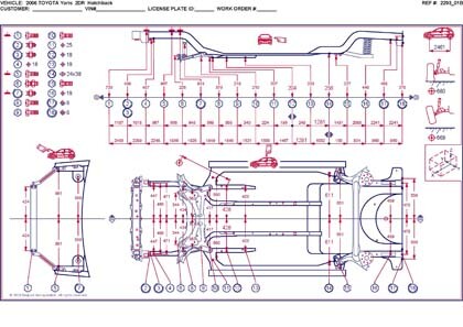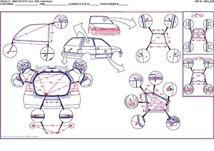 -Геометрические размеры автомобилей американского рынка, как проекционные, так и непосредственного измерения, в том числе диагональные размеры проемов кузова и контрольные точки для восстановления геометрии.
