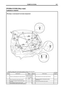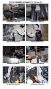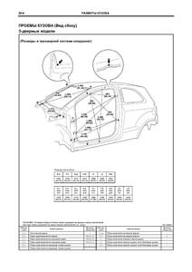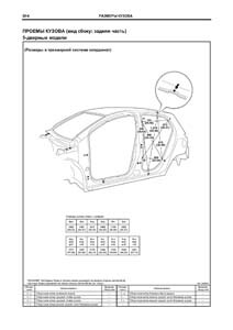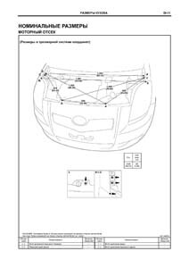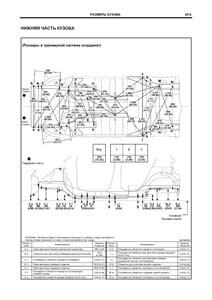 - Проекционные геометрические размеры кузова с привязкой к стапелю. Дополнительно приведены цветные фотографии мест расположения контрольных точек на реальном автомобиле.