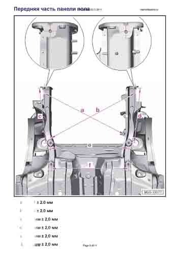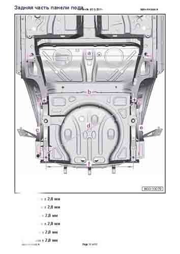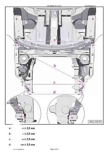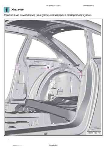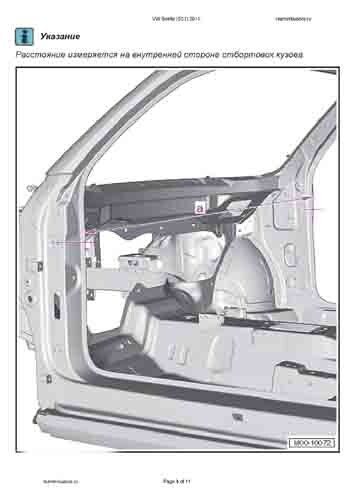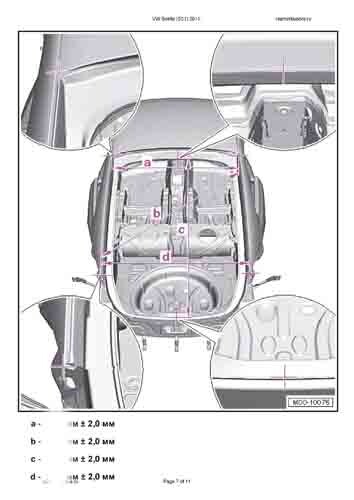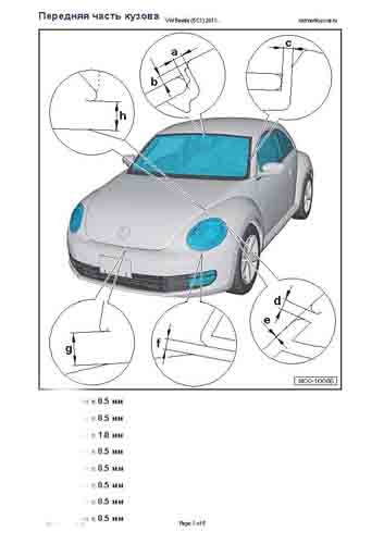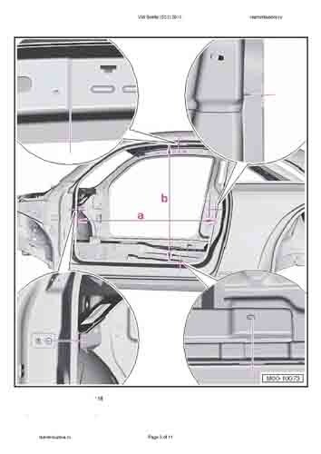- Из заводского руководства по ремонту кузова VW Beetle (5C1) 2011-2015, в том числе диагональные размеры проемов кузова и сведения о допустимых зазорах кузовных панелей. Производитель предупреждает: "Все размеры используются только для проверки; точные размеры задаются стапелем."
