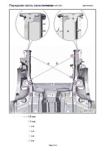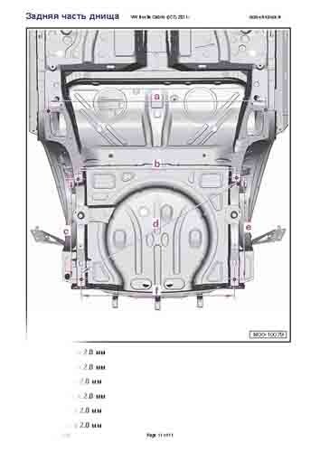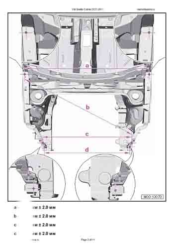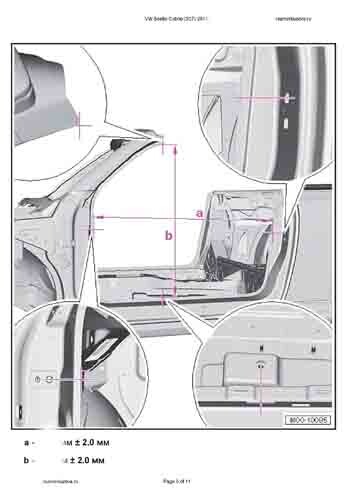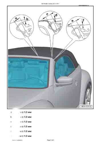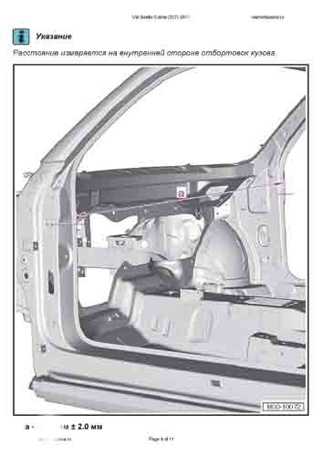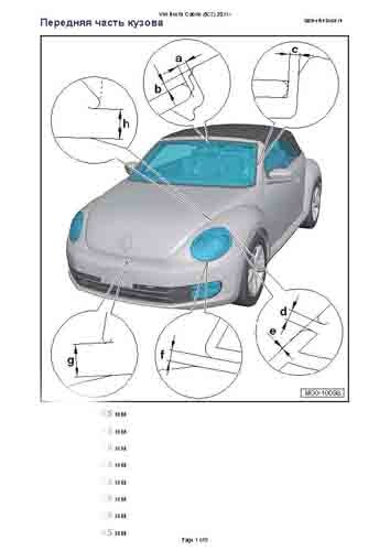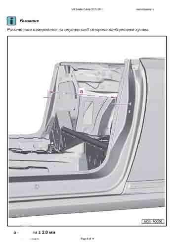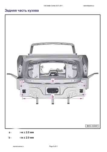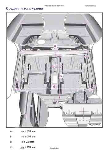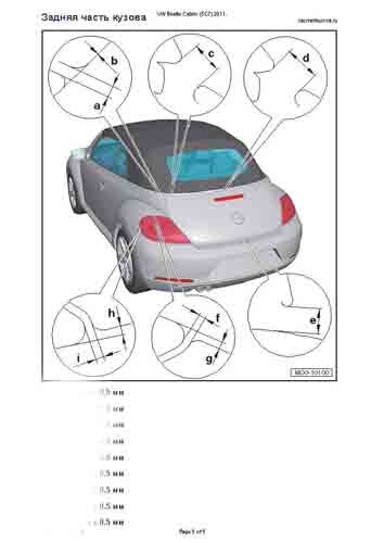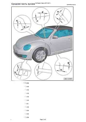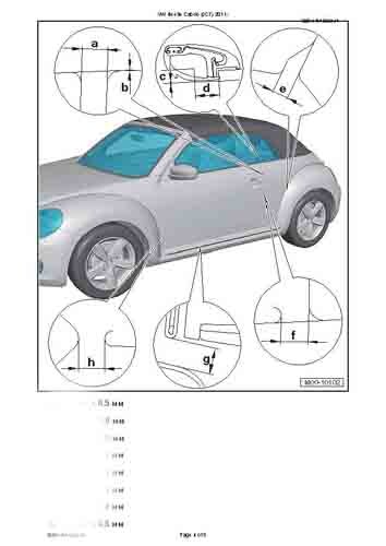 - Из заводского руководства по ремонту кузова VW Beetle Cabrio (5C7) 2011-2015, в том числе диагональные размеры проемов кузова и сведения о допустимых зазорах кузовных панелей. Производитель предупреждает: "Все размеры используются только для проверки; точные размеры задаются стапелем."