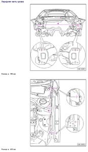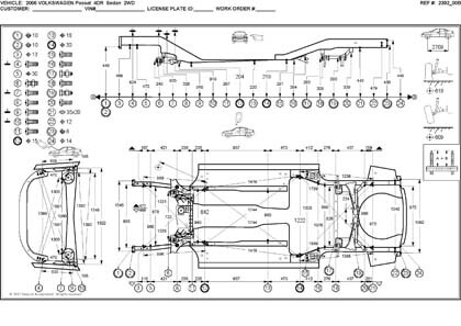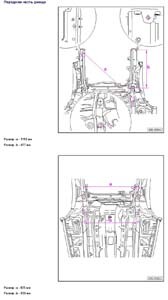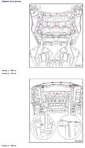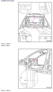 - Проекционные размеры с привязкой к стапелю. Дополнительно приведены цветные фотографии мест расположения контрольных точек на реальном автомобиле.