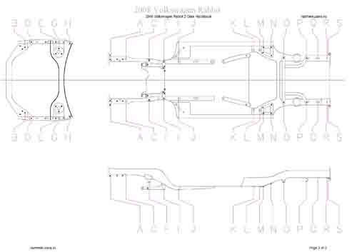 - Геометрические размеры кузова VOLKSWAGEN Rabbit 2006-2009, как проекционные, так и непосредственного измерения, в том числе диагональные размеры проемов кузова и контрольные точки для восстановления геометрии кузова.