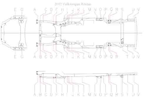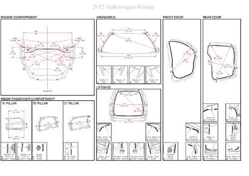 - Геометрические размеры кузова VOLKSWAGEN Routan 2008-2013, как проекционные, так и непосредственного измерения, в том числе диагональные размеры проемов кузова и контрольные точки для восстановления геометрии кузова.