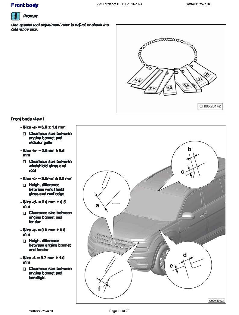 - Из заводского руководства по ремонту кузова VOLKSWAGEN Teramont (CU1) China B-SUV 2021-2025, в том числе размеры проемов. Дополнительно приведены величины допустимых зазоров кузовных панелей.