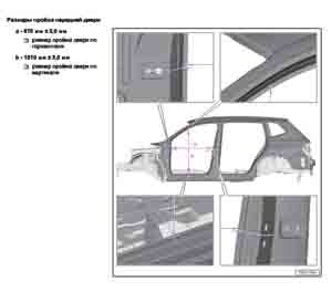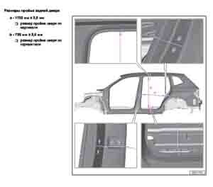 - Из заводского руководства по ремонту кузова VOLKSWAGEN Touareg (RC8) 2023--, в том числе размеры проемов. Дополнительно приведены величины допустимых зазоров кузовных панелей.