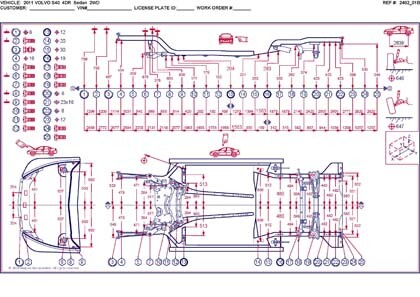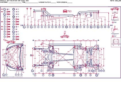 - Геометрические размеры кузова VOLVO S40 2004-2012, как проекционные, так и непосредственного измерения, в том числе диагональные размеры проемов кузова и контрольные точки для восстановления геометрии.