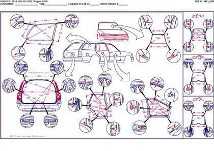 - Геометрические размеры кузова VOLVO XC90, как проекционные, так и непосредственного измерения, в том числе диагональные размеры проемов кузова и контрольные точки для восстановления геометрии.
